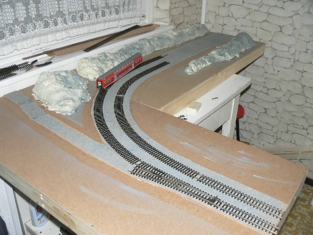 Használunk PUR-habot,kisebb,nagyobb dombok készítéséhez. Ez is könnyen formálható szikével, fűrészlappal.