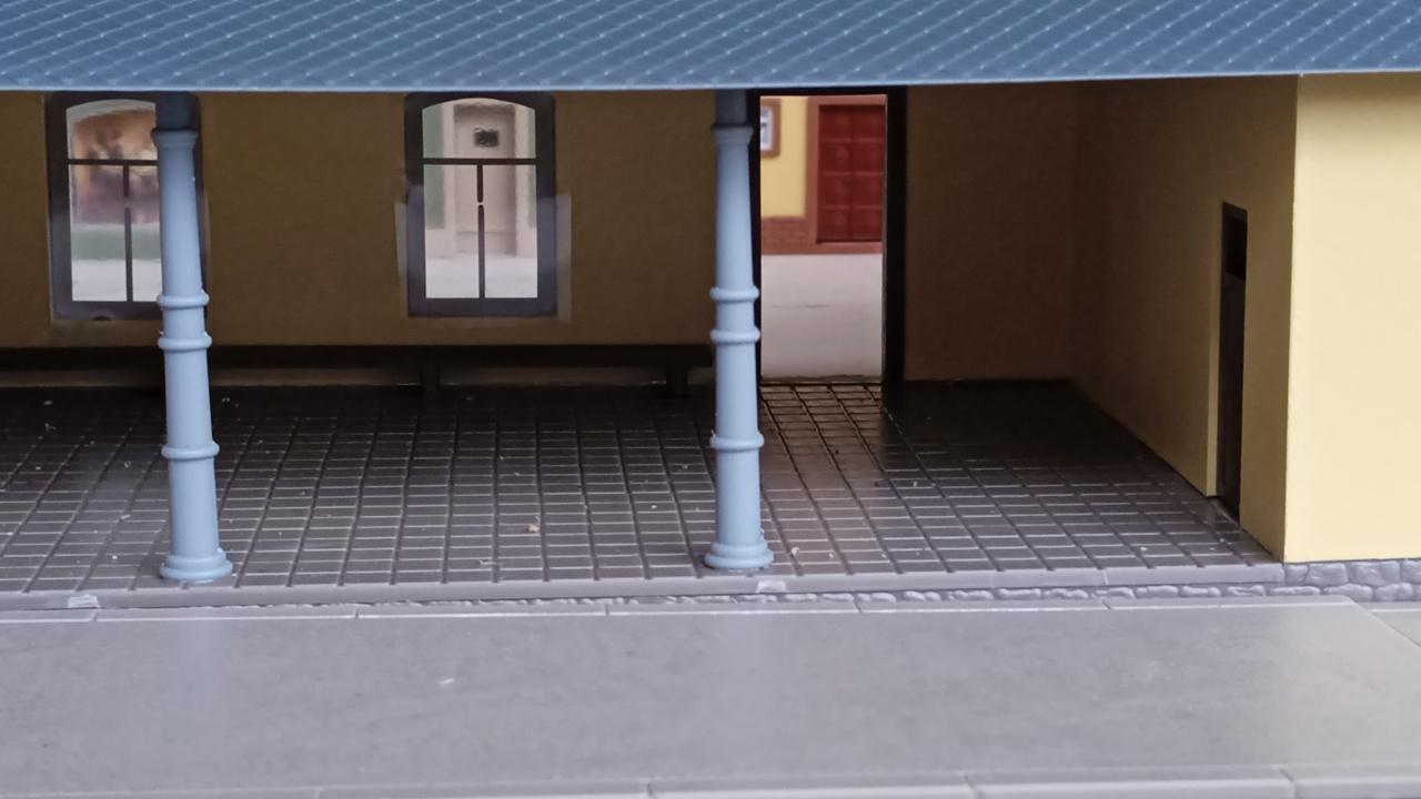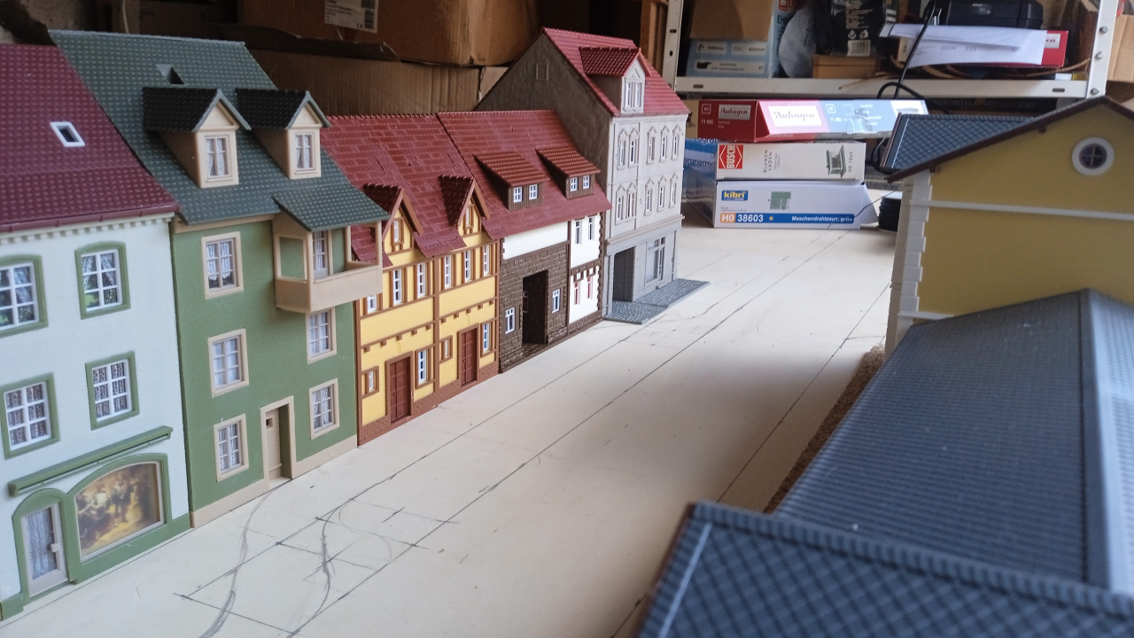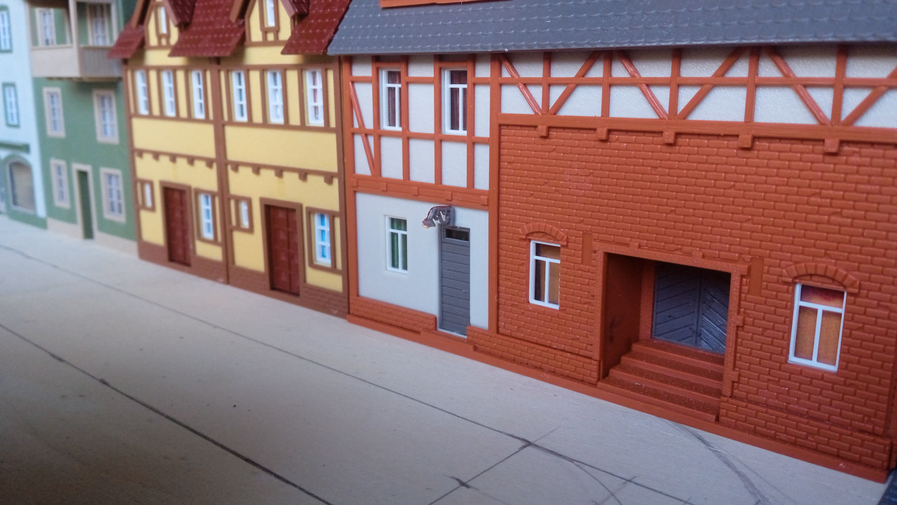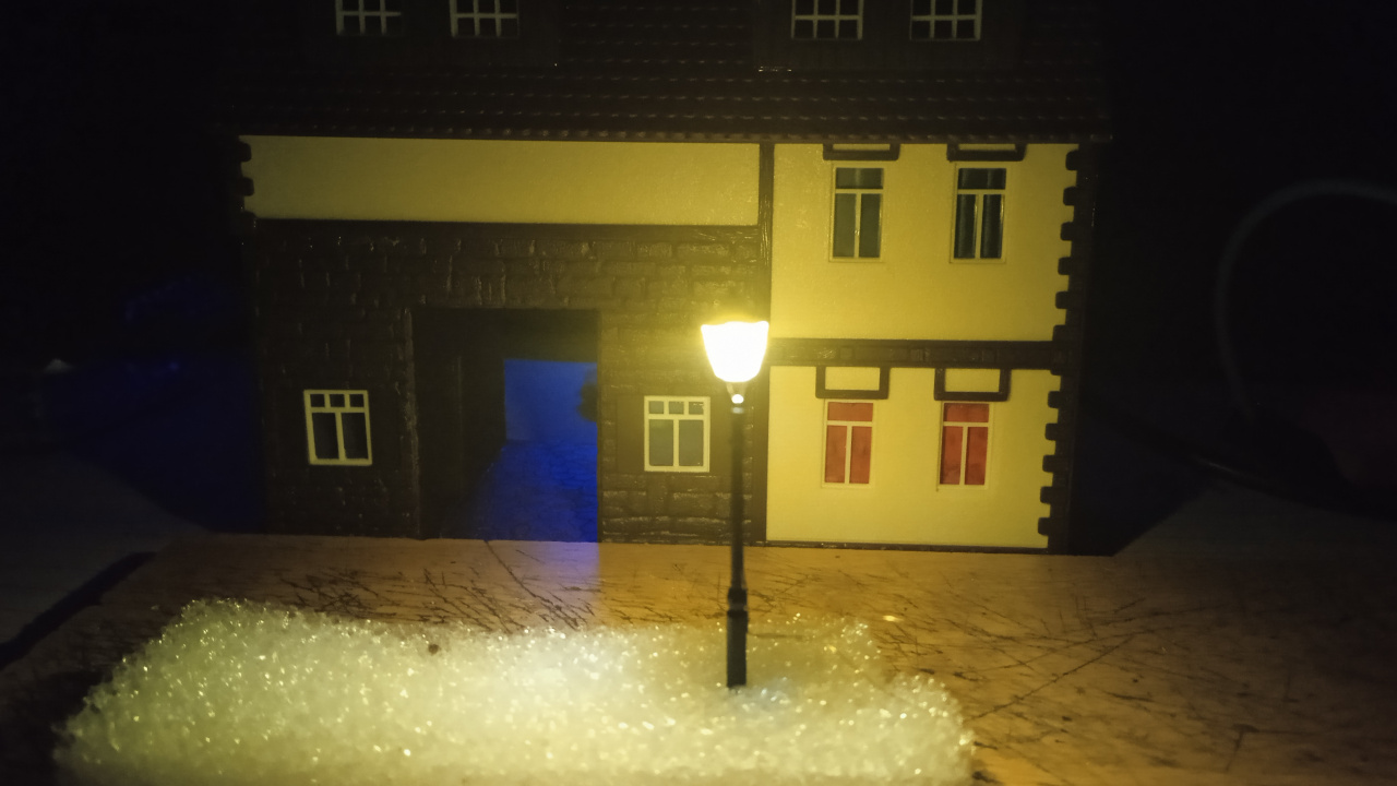 Egy hangulatkép a városi utcáról, még csak így nyersen. A Vollmer épületén, az ajtó feletti lámpa majd világítani is fog. Eredetileg erre a gyártó nem gondolt, de azért mi megcsináltuk. |