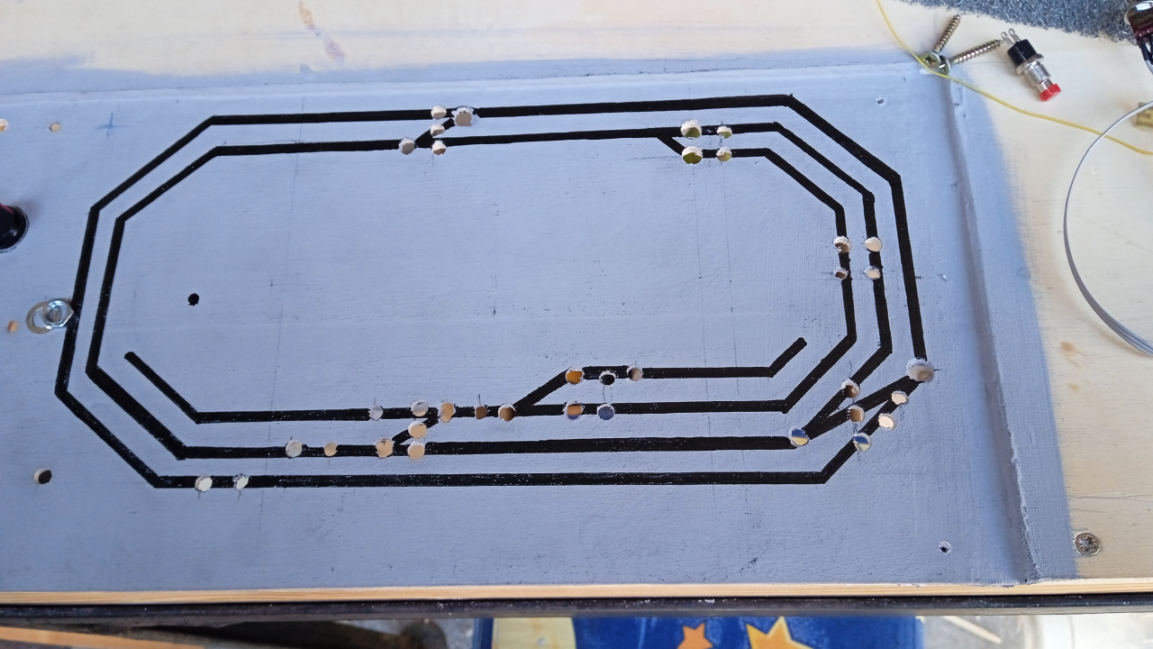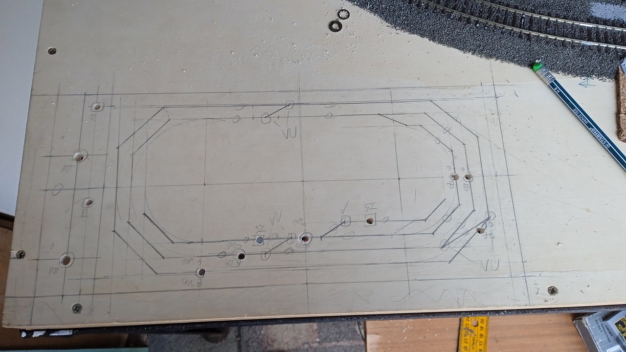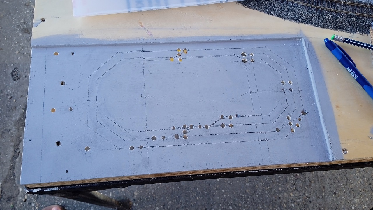 Be van sűlyesztve a pálya névleges szintje alá, a 8mm-es rétegelt lenezt itt a felére, 4mm-re vékonyítottuk. Kapott egy világos szürke alapozást a felület, és egyelőre az látszik, hogy a pálya sematikus rajza vékonyan, ceruzával rá van rajzolva. A rajzolaton a furatok a nyomógombok, kapcsolók, visszajelző LED-k furatai. A rajzolattól jobbra, az üresnek látszó részen lesznek, egymástól nagyobb távolságra elkülönítve a két áramkör - a külső, és a belső ovál - PWM vezérlésének a kezelőszervei lesznek, a zárlatvédelem LED-jei, és a két áramkör közötti áthaladást jelző izzó. Utóbbi akkor fog pirosan világítani, ha a két PWM szabályzó ellentétes menetirányban működik éppen, vagy pl. a külső oválról a belsőre való áthaladás zárlatot okozna. Talán írtam korábban, hogy a laikusok számára könnyebben megérthető, "A kapcsolásban" fog működni az asztal. |