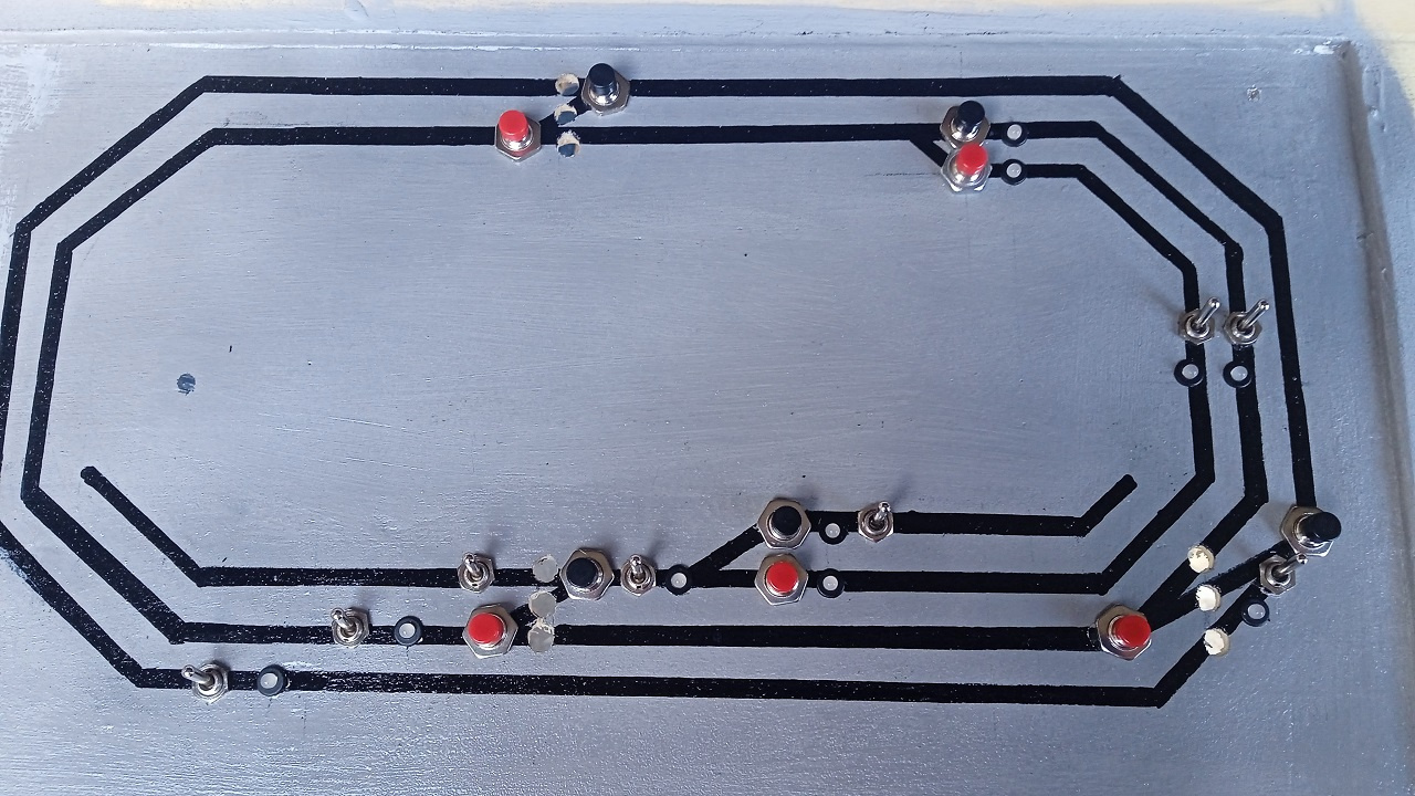 Első képen a leendő kapcsolópult helye. Pár kapcsoló, vezérlőelem helye már kifúrva, a pálya sematikus rajzával. |