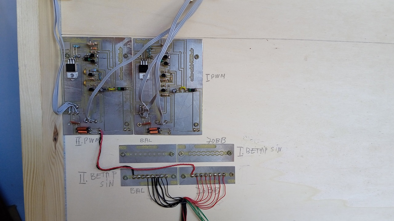 Igen a PWM szabályzók a műhely 25 éves konstrukciója. Van ennél jobb? Nyilván van. Van ennél olcsóbb? Van, kínai, csak annak gyakorlatilag nincs zárlatvédelme a kimenetén, így erre a célra nem használhatók. A 25 éves NYÁK lemez terve az akkor beszerzhető alkatrészekre készült. Azóta azért történt egy, s más, így a vannak olyan alktrészek, amelyeket nem szükséges beültetni, ezért vannak üres helyek a NYÁK lemezeken.