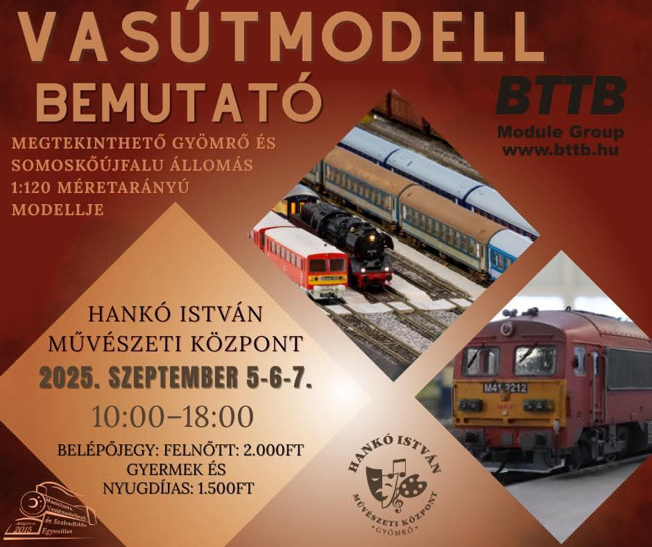 Vasútmodell kiállítás lesz Gyömrőn a Hankó István Művészeti Központ és a BTTB Modulközösség szervezésében, szeptember 5-től 7-ig naponta 10 és 18 óra között!