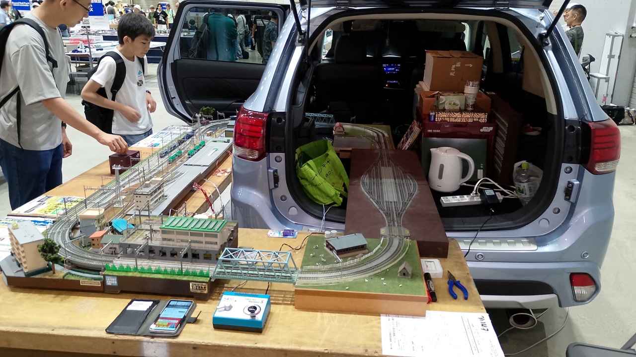 Egy kiállitás Japánban a Maglev vasuttal N méretben meg levegöben állo gözmozdonnyal meg egy kocsival.