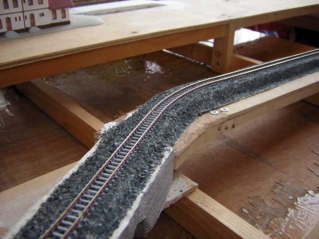 Mielőtt az ágyazat anyagot kiszórtam, egy-két helyen kétoldalas ragaszószalaggal fogtam le vágányzatot. Az ágyazat kötése után már az fogja rendesen!