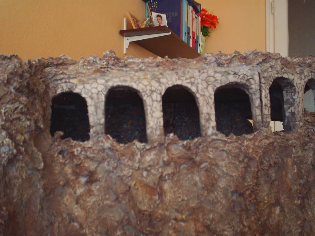 Jó melegek voltak az elmúlt hetekben. Nem is haladt úgy a munka ahogy szerettem volna, de most hogy jött ez a kis lehűlés, neki is láttam az építésnek. Készítettem egy árkádos részt. Nem találtam róla képet ami alapján készíthettem volna, így saját elgondolás alapján csináltam. Nem is ez a fontos, hanem az hogy nem sikerültek szép egyformára a boltívek és nem vagyok megelégedve vele.  Szerintetek maradhat így vagy még dolgozzak rajta? A színezés, még csak alapozás rajta. |