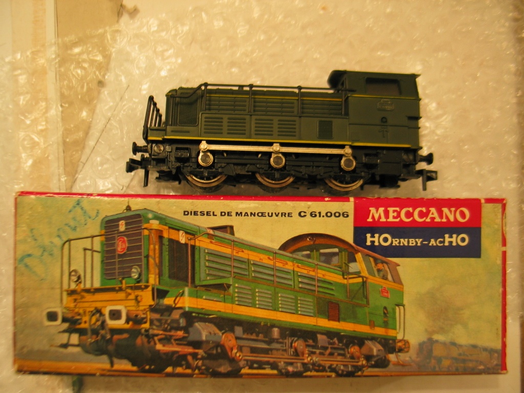 Bemutatom neked az eddigi legöregebb "Nyugati-Blokk" -ból származó mozdonyom: SNCF C61.000 mozdonya, még a Meccano-Hornby cég készítette jó ötven éve. Mint a dobozfeliraton is látszik, H0 -ás és egyenáramú perma motor döngicsél benne. |