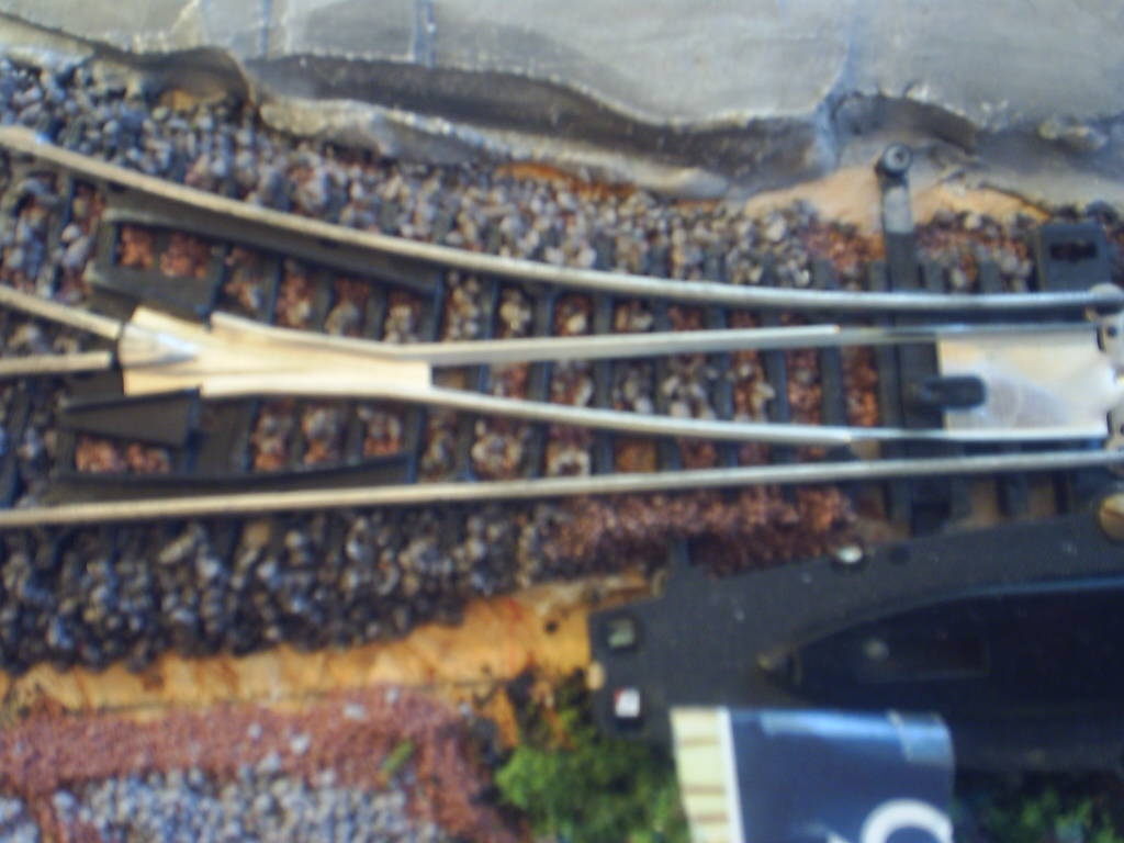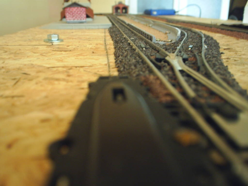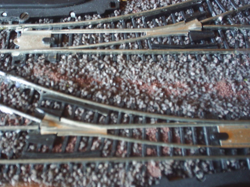 A váltót is kavicsoztam, igaz kevesebbet mint a többi sín közé. Ha a mozgó alkatrészek közé esett véletlenül akkor kisöpörtem ecsettel. Minden talpfa közé 1 csepp ragasztó keverék. |