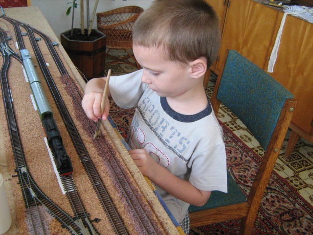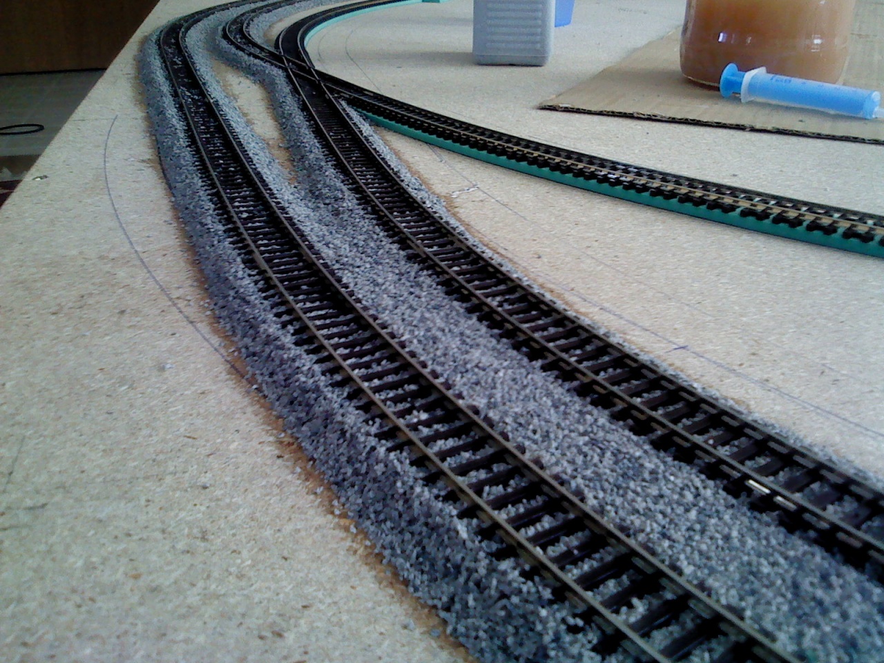 A mosogatószeres vizes fröcskölést én egy egyszerű "spricni"-vel oldom meg. Viszonylag távolról (kb. 40 cm-ről) szórom (hogy a permettel távozó levegő ne fújja szét a követ) és nem spórolok vele (a víz és a mosogatószer az egyik talán legolcsóbb kellékanyaga a vasútmodellezésnek), magyarul alaposan átáztatom az ágyazatot. Utána fecskendőből, nagyon közelről, lassan csepegtetem a ragasztót. Az átázott ágyazatban szépen terül. |