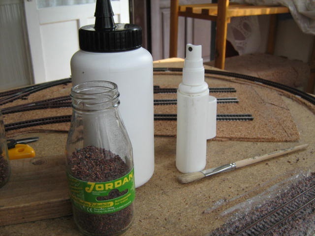 A mosogatószeres vizes fröcskölést én egy egyszerű "spricni"-vel oldom meg. Viszonylag távolról (kb. 40 cm-ről) szórom (hogy a permettel távozó levegő ne fújja szét a követ) és nem spórolok vele (a víz és a mosogatószer az egyik talán legolcsóbb kellékanyaga a vasútmodellezésnek), magyarul alaposan átáztatom az ágyazatot. Utána fecskendőből, nagyon közelről, lassan csepegtetem a ragasztót. Az átázott ágyazatban szépen terül. |