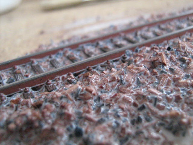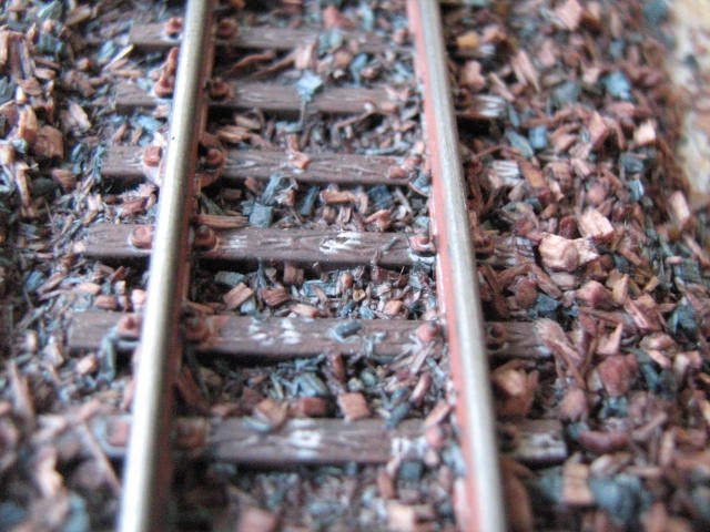 A váltót is kavicsoztam, igaz kevesebbet mint a többi sín közé. Ha a mozgó alkatrészek közé esett véletlenül akkor kisöpörtem ecsettel. Minden talpfa közé 1 csepp ragasztó keverék. |