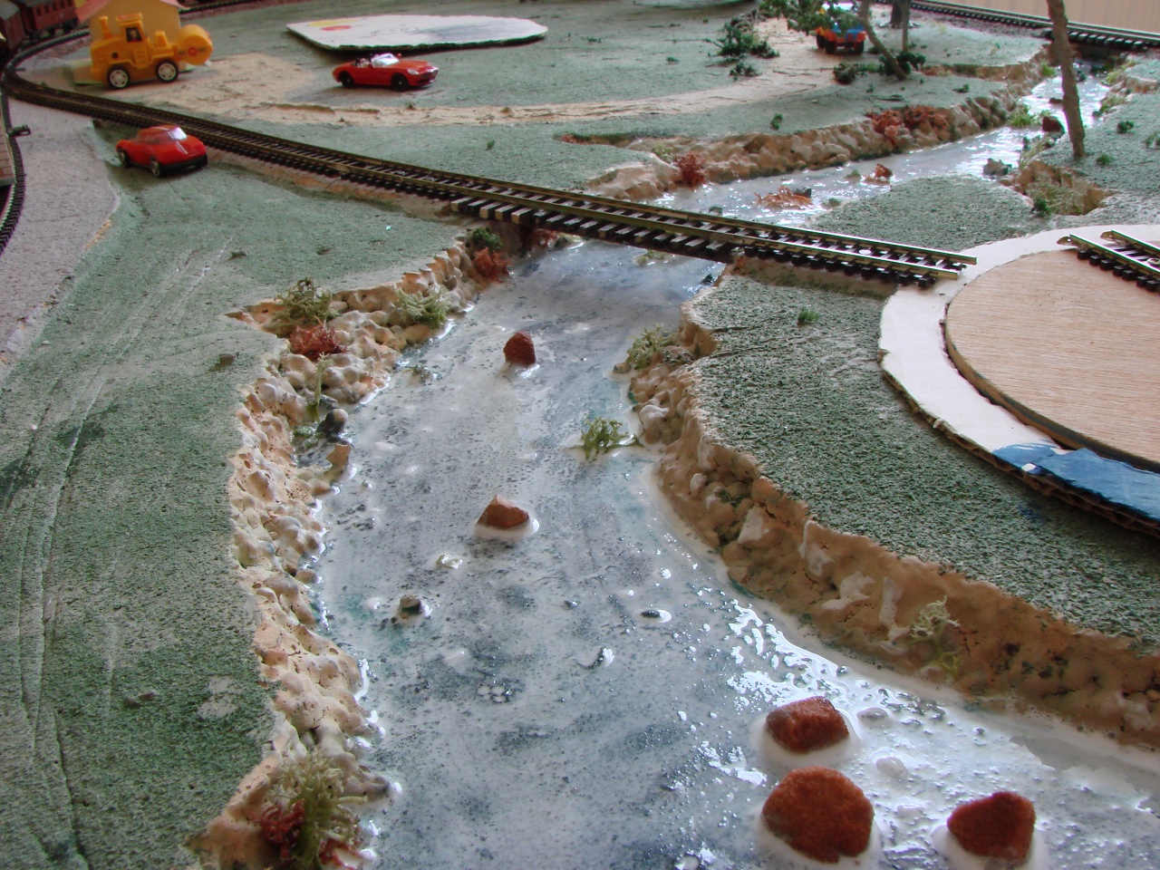 A képen a legujabb terepasztalon a fiammal Woodland Scenic modellvizét használtuk. Szerintem ugyanaz, mint a fehér faragasztó. Ha az ember elöre kialakitja a vizmedrét, és nem tul vastagon önti le, akkor nagyon jó eredményt kap. |